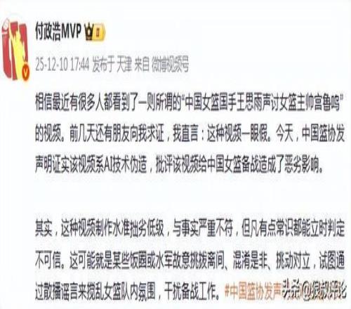 媒体人付政浩发文点评说道“这种视频制作水准拙劣低级,与事实严重不符,但凡有点常识都能立时判定不可信。这可能就是某些饭圈或水军故意挑拨离间、混淆是非、挑动对立,试图通过散播谣言来搅乱女篮队内氛围,干扰备战工作。”