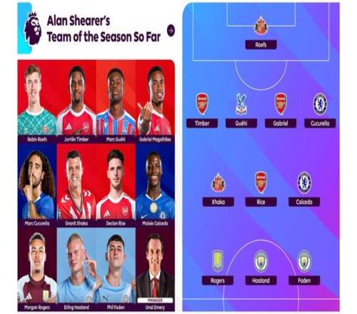 英超官方发布了阿兰-希勒评选的英超本赛季至今最佳阵容,哈兰德领衔,赖斯、凯塞多、扎卡等人在列。